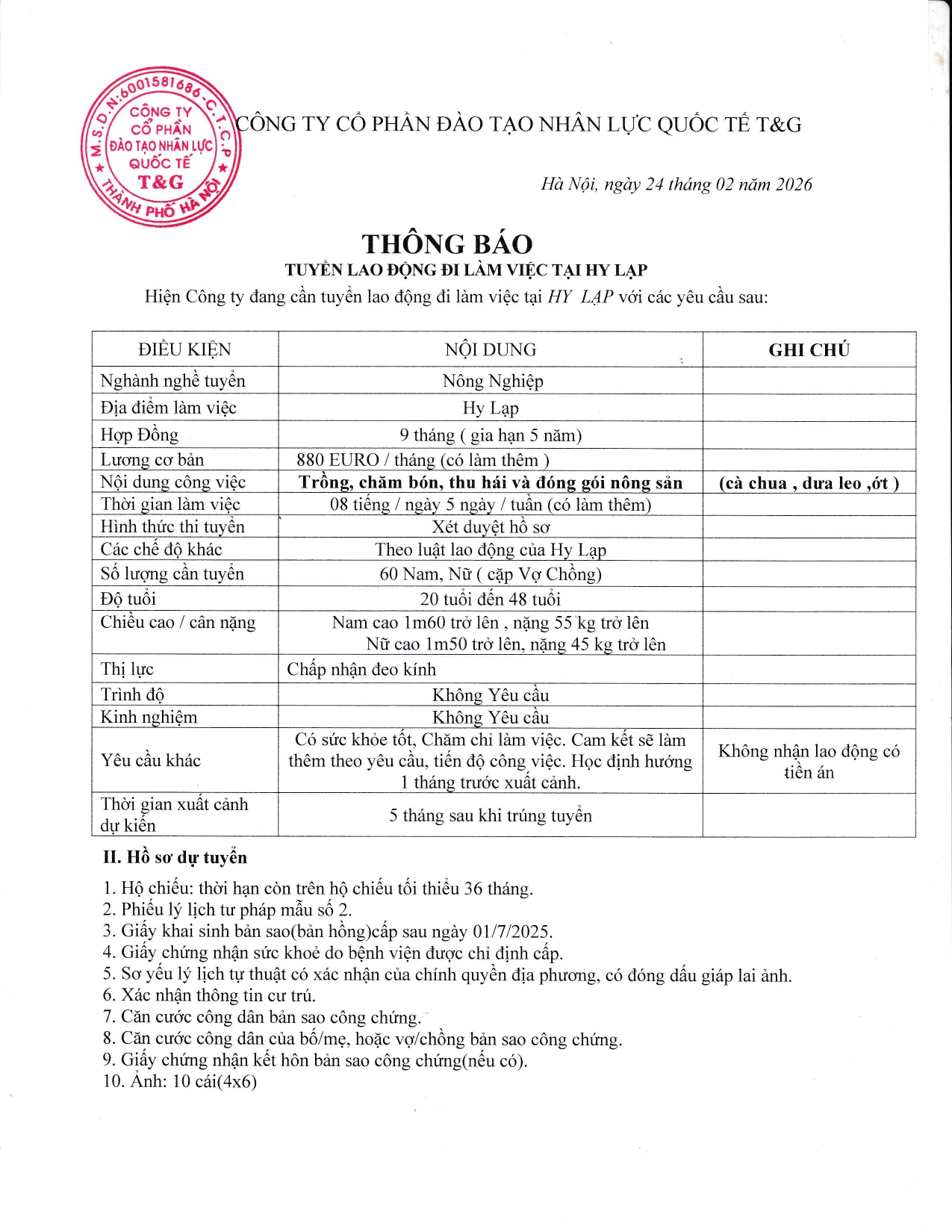 Công ty T&G cần tuyển lao động làm việc tại Hy Lạp ngành Nông nghiệp